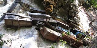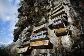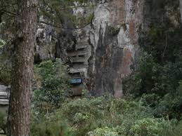 En efecto, estos habitantes de la zona de Segada han conservado una costumbre funeraria muy particular. Sus muertos son despedidos en ataúdes de madera que en lugar de ser enterrados, son elevados a lo alto de los acantilados, según ellos, lo más cerca posible del cielo.